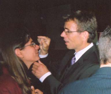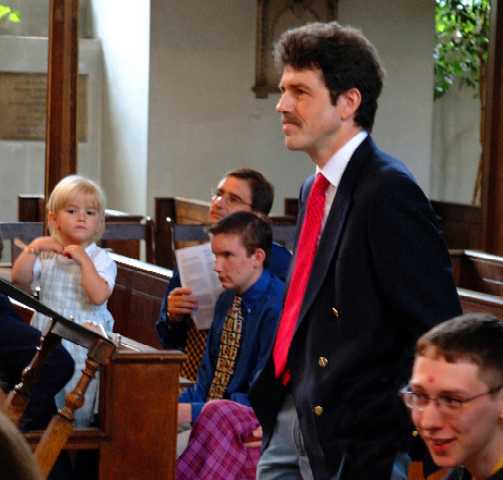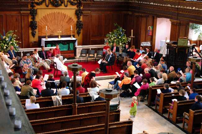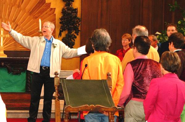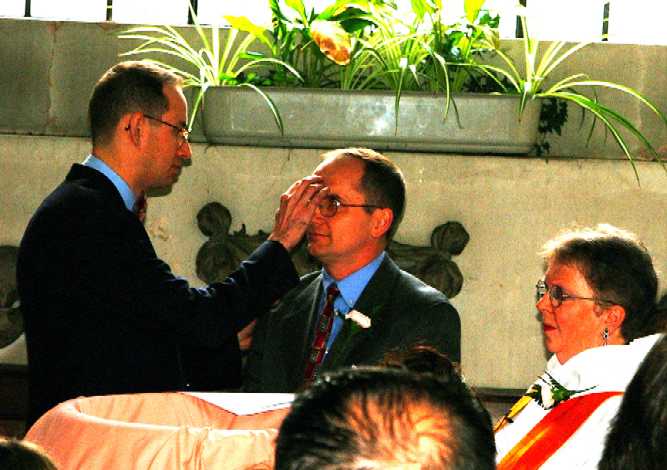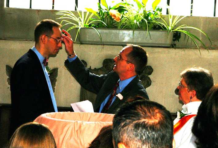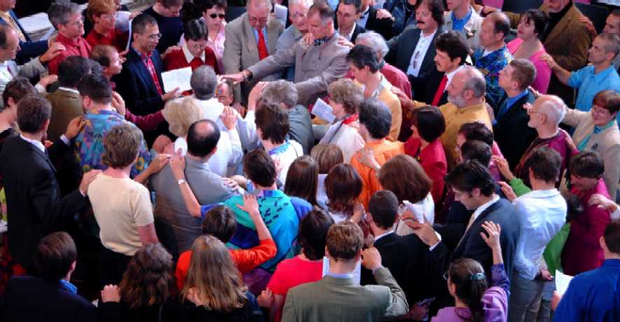 The minister invites the congregation to get in contact with the couple and each other by placing a hand on a nearby shoulder.